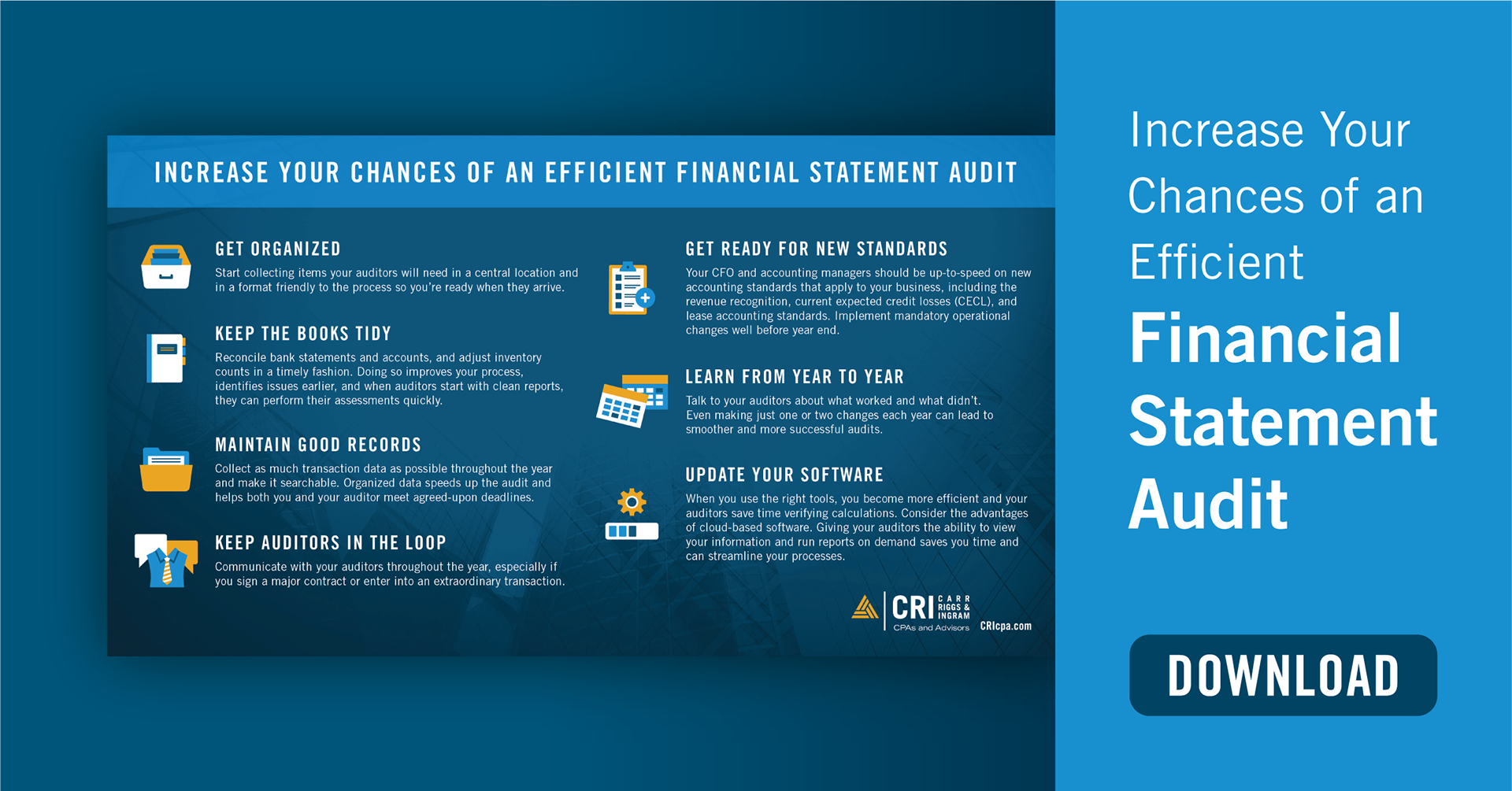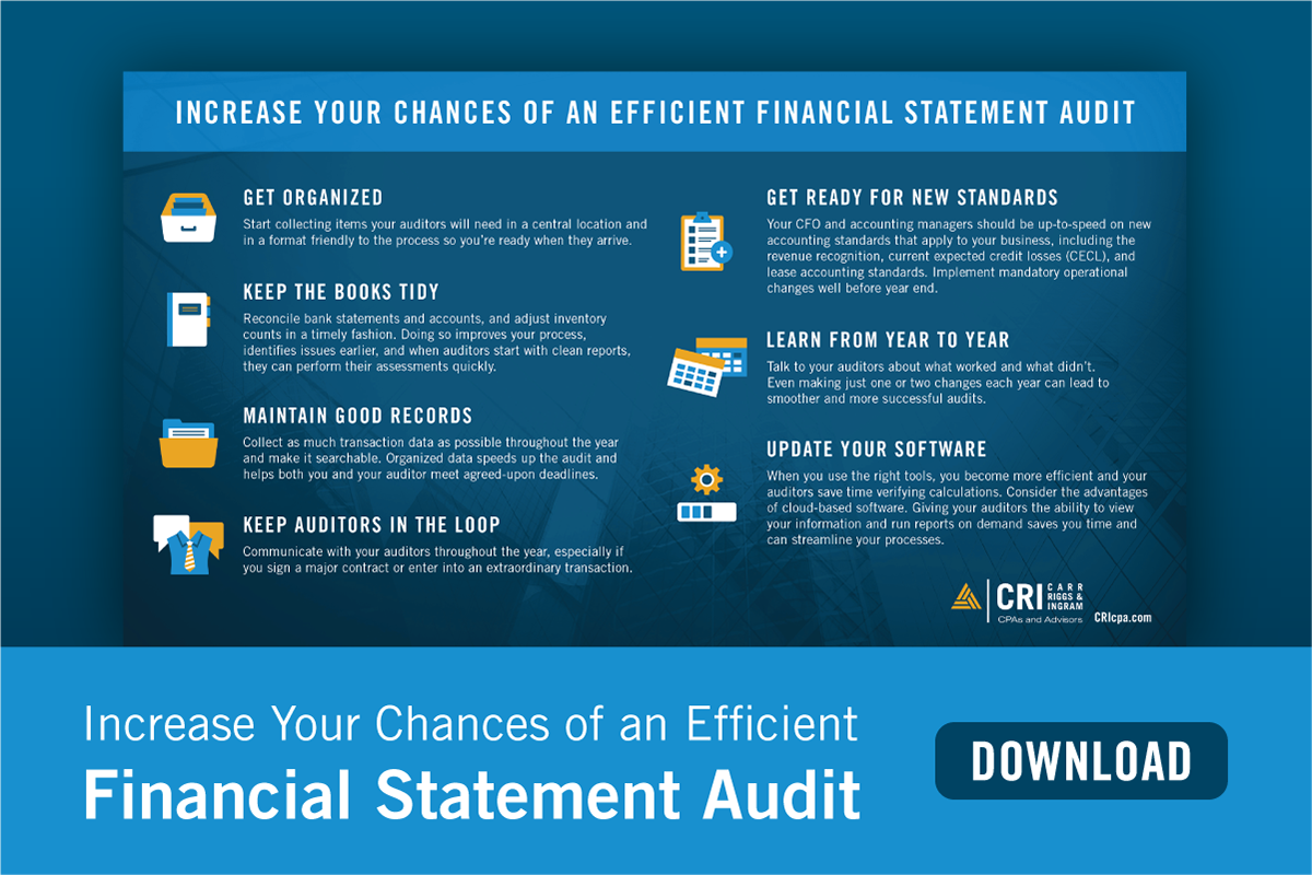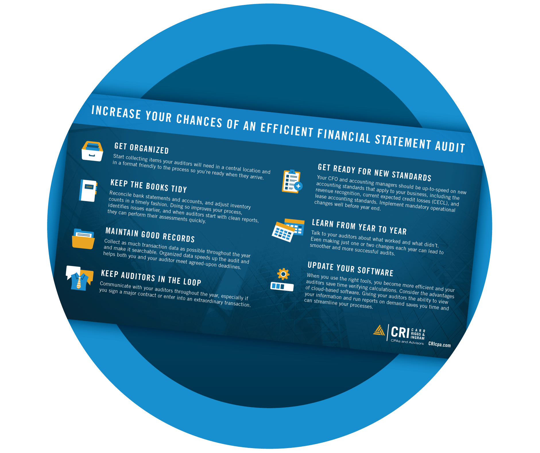 Informational postcard encouraging individuals to keep in mind the list of recommended action items for an efficient financial statement audit, as they prepare for audit season.